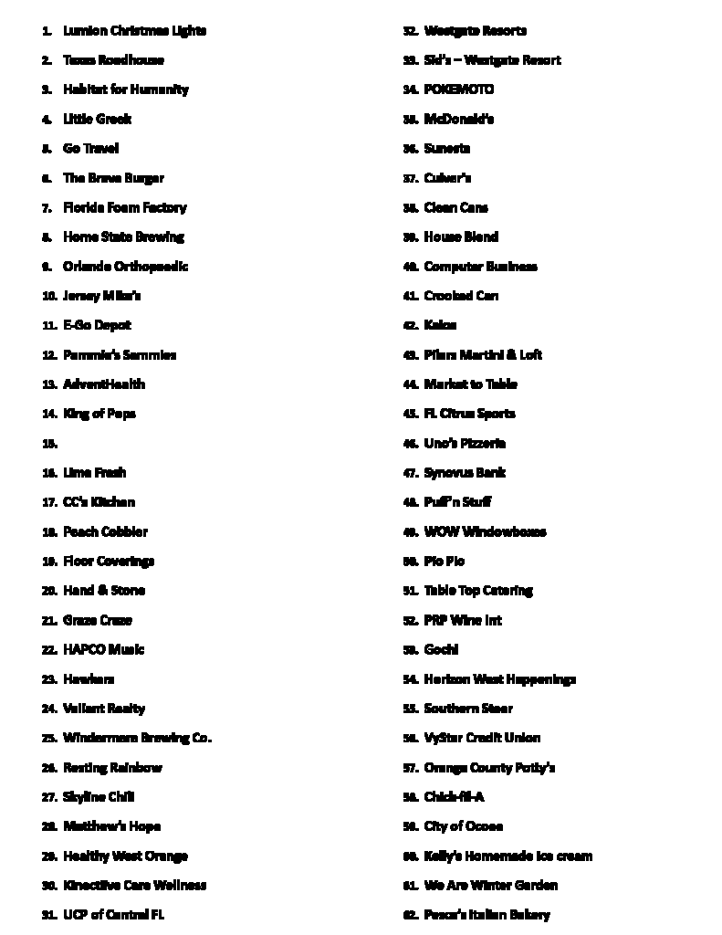 The West Orange Chamber of Commerce is a state certified chamber of commerce serving West Orange County of Florida as a 501-(c)-6. As the leading business advocate in West Orange County Florida, the West Orange Chamber of Commerce provides exposure, publishes promotional material, and provides marketing channels to and for its members. While the West Orange Chamber of Commerce maintains strict editorial control over all content that it distributes and publishes on behalf of its membership that is received from or provided by Chamber Members which is published by the Chamber, your use of and reliance upon any or all such matters is at your sole risk and you are cautioned to do your own independent investigation and evaluation before using or relying on any such matters. The West Orange Chamber is not responsible for and makes no warranties or representations of the accuracy, authority, or ownership of materials, photographs, offers, statements, assertions, or any other matter and content.
