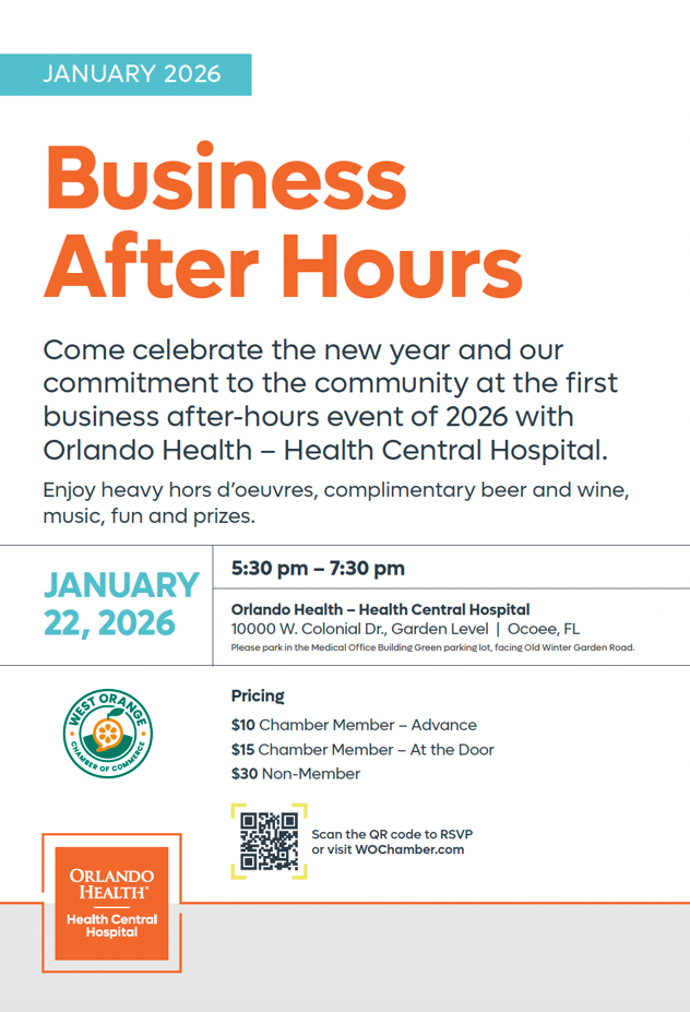 Celebrate Serving our Community! Join us at Orlando Health – Health Central Hospital creating connections with local professionals. Build new relationships, engage with fellow business members, and connect with leaders.  Enjoy heavy hors d’oeuvres, complimentary beer and wine, and door prizes. Be sure to register today!