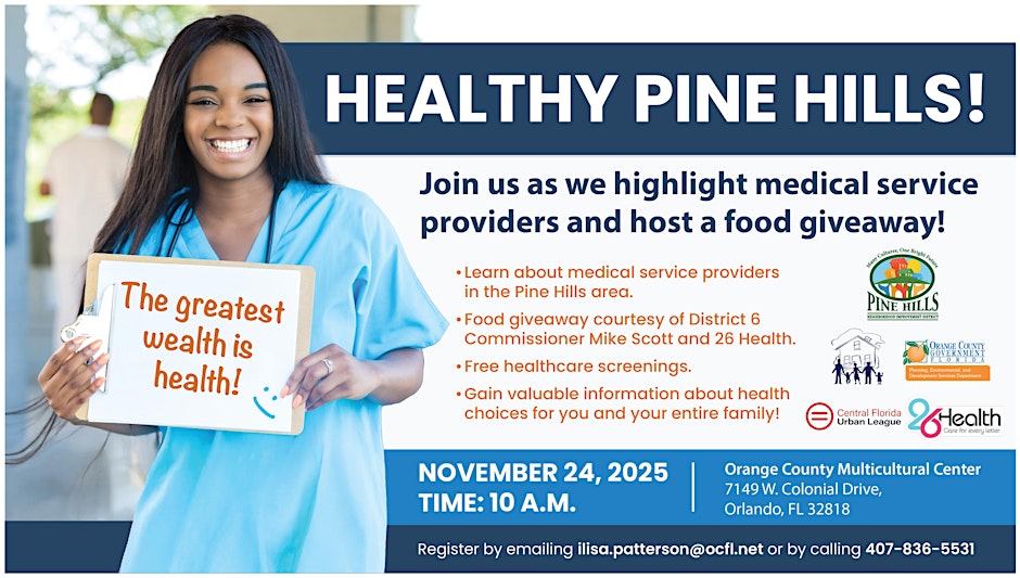 Join us on November 24, 2025 for a healthy good time! We will have various medical providers from the community speaking with the attendees as well as a food giveaway sponsored by District 6 Commissioner, Mike Scott and 26Health. You may register by using the Eventbrite link below.  Feel free to share with your networks.