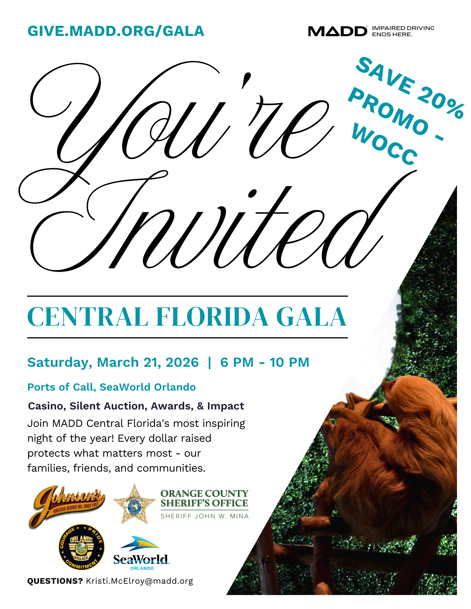 Join MADD Central Florida’s most inspiring night of the year – its Central Florida Gala on Saturday, March 21 from 6-10 p.m. at Ports of Call at SeaWorld Orlando. Every dollar raised protects what matters most – our families, friends and communities.
