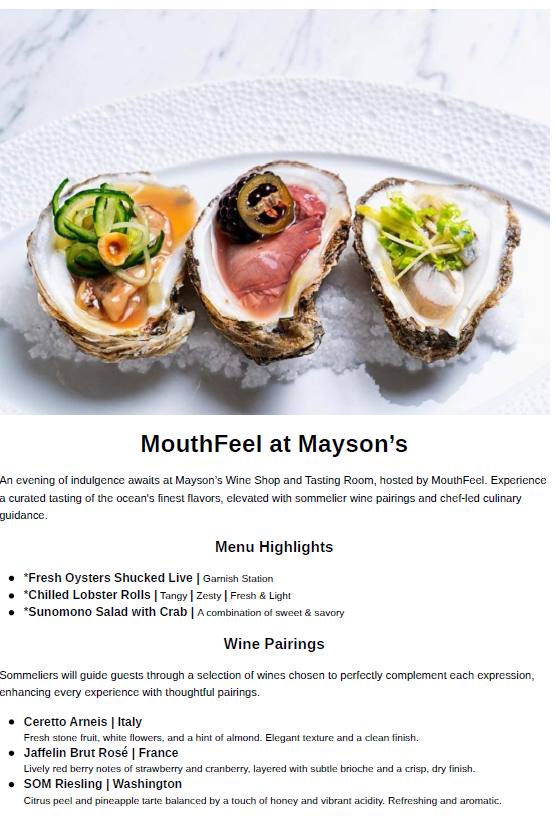 An evening of indulgence awaits at Mayson’s Wine Shop and Tasting Room, hosted by MouthFeel. Experience a curated tasting of the ocean’s finest flavors, elevated with sommelier wine pairings and chef-led culinary guidance.