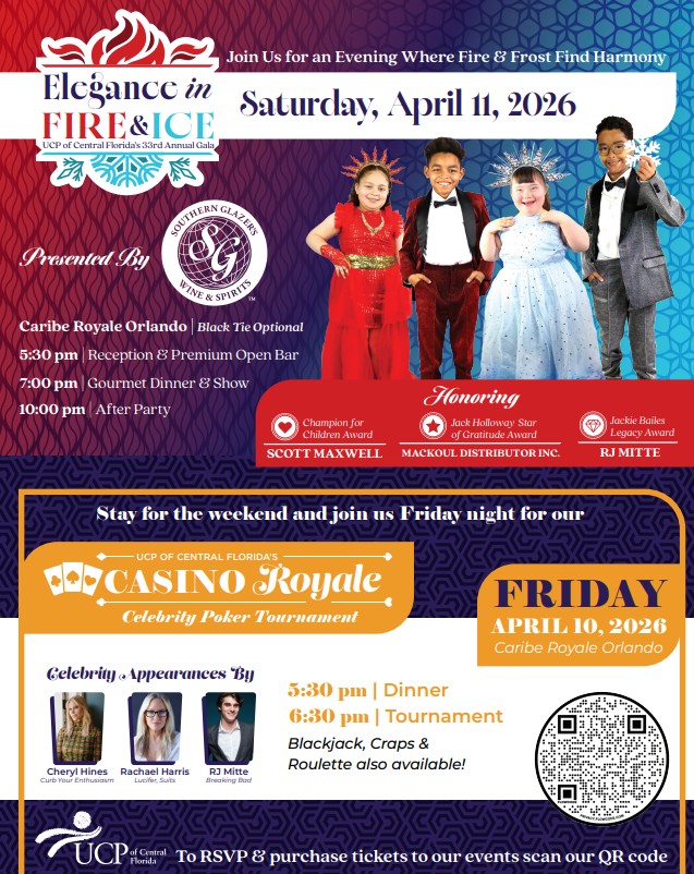 UCP of Central Florida invites the community to its 33rd Annual Fire and Ice Gala Weekend at Caribe Royale Orlando, a meaningful opportunity to support children and families across our region. Join us for a one or two-night experience featuring a Celebrity Poker Tournament on Friday, April 10 and the Elegance in Fire and Ice Gala on Saturday, April 11. Guests will enjoy a premium open bar, gourmet dinner, live entertainment, an after party, and special celebrity appearances throughout the weekend!